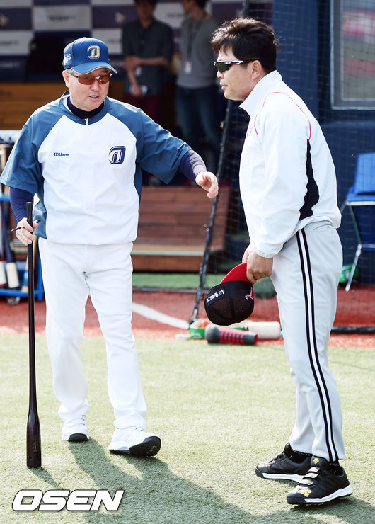 24일 오후 창원시 마산구장에서 열리는'2015 타이어뱅크 KBO리그' NC 다이노스와 LG 트윈스의 경기에 앞서 LG 양상문 감독과 NC 김경문 감독이 악수를 나누고 있다