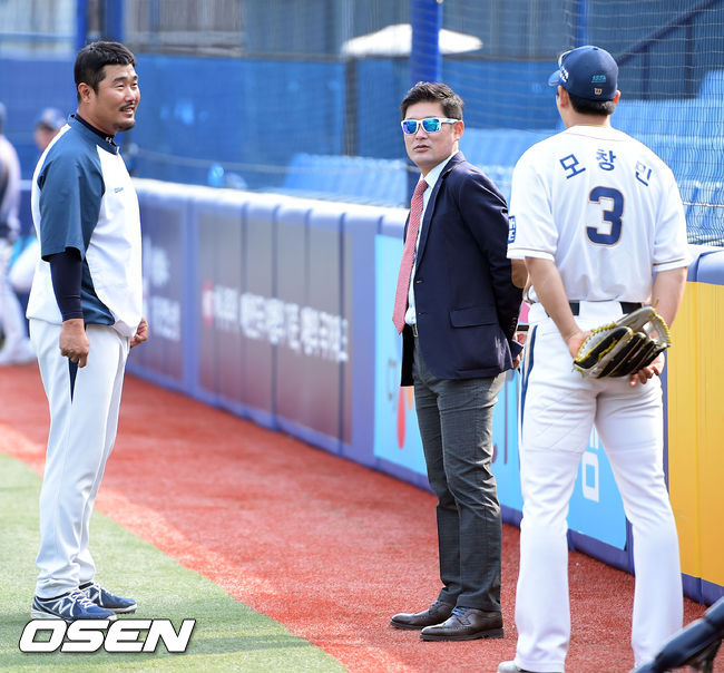 24일 오후 창원시 마산구장에서 열리는'2015 타이어뱅크 KBO리그' NC 다이노스와 LG 트윈스의 경기에 앞서 이종범 해설위원이 NC 이호준, 모창민과 이야기를 나누고 있다.