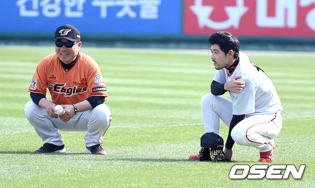 경기에 앞서 한화 김광수 코치와 이용규가 이야기를 나누고 있다.
