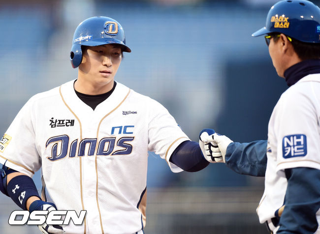 24일 오후 창원시 마산구장에서 열린'2015 타이어뱅크 KBO리그' NC 다이노스와 LG 트윈스의 경기, 1회말 무사 1,3루 NC 나성범이 선취 1타점 적시타를 날리고 전준호 코치와 하이파이브를 하고 있다.