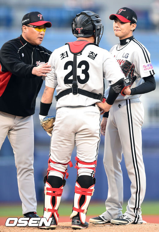 24일 오후 창원시 마산구장에서 열린'2015 타이어뱅크 KBO리그' NC 다이노스와 LG 트윈스의 경기, 1회말 무사 만루 위기를 맞은 LG 선발투수 임정우가 최경철 포수와 마운드서 이야기를 나누고 있다.