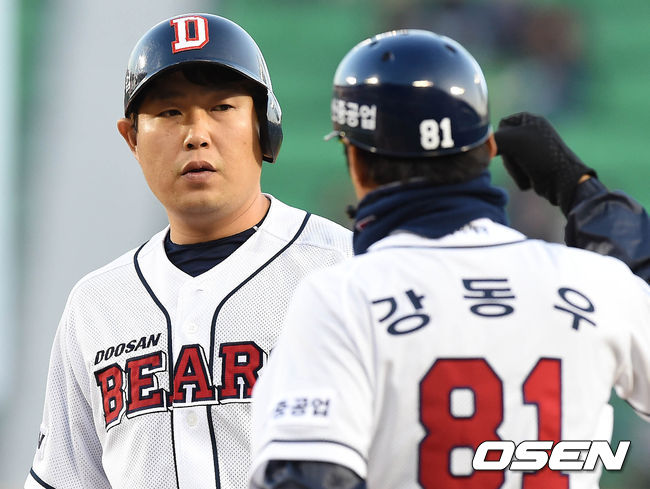 24일 오후 서울 잠실구장에서 열린 '2015 타이어뱅크 KBO 리그' 두산 베어스와 KIA 타이거즈의 경기 1회말 2사 1,3루 양의지가 1타점 적시타를 치고 강동우 코치와 하이파이브를 하고 있다.
