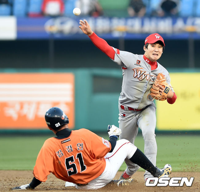 1회말 1사 1루 SK 박계현이 한화 김태균의 내야 땅볼때 1루주자 김경언을 포스아웃으로 잡아낸 뒤 1루로 송구하고 있다.