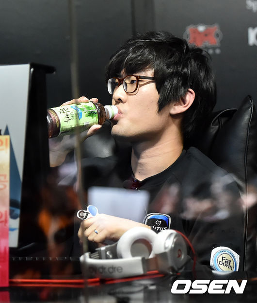 CJ의 '엠비션' 강찬용이 1세트를 따낸 후 음료를 마시고 있다.