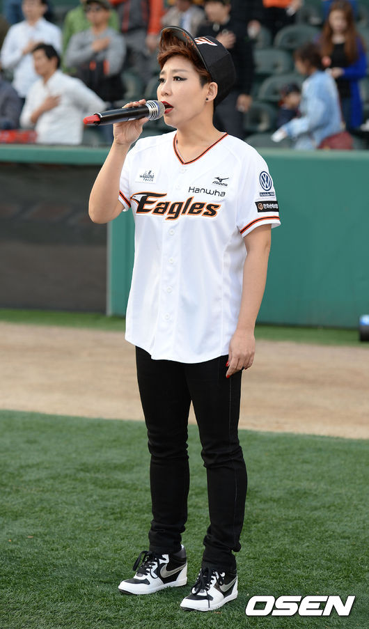 경기에 앞서 가수 리아가 애국가를 부르고 있다.