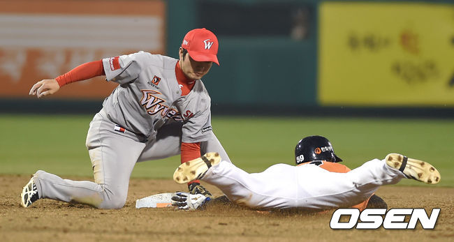 3회말 1사 1루 SK 김성현이 2루 도루를 시도하는 한화 송주호를 아웃시키고 있다.