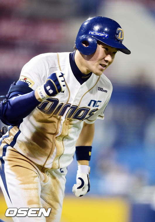 24일 오후 창원시 마산구장에서 열린'2015 타이어뱅크 KBO리그' NC 다이노스와 LG 트윈스의 경기, 4회말 2사 3루 NC 박민우가 1타점 적시타를 날린뒤 주먹을 쥐며 환호하고 있다.
