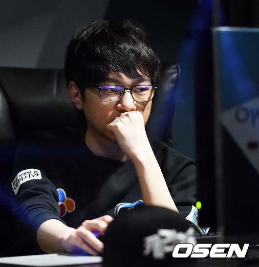 CJ가 1세트에서 승리를 거둔 후 CJ '매드라이프' 홍민기가 생각에 잠겨있다.