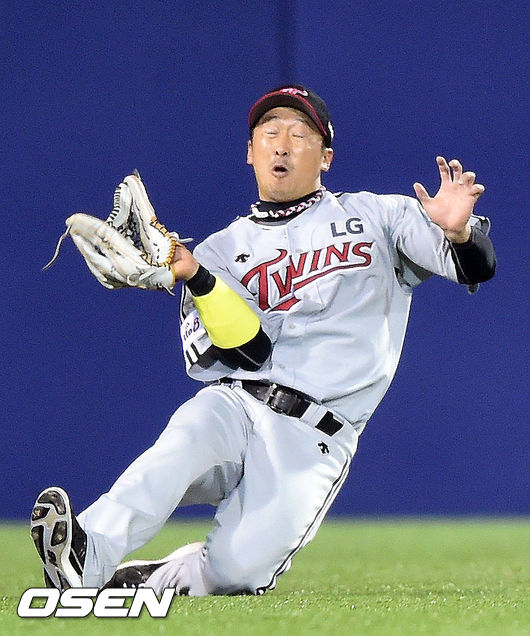 24일 오후 창원시 마산구장에서 열린'2015 타이어뱅크 KBO리그' NC 다이노스와 LG 트윈스의 경기, 4회말 2사 1루 NC 김종호의 외야플라이 타구를 LG 이병규 좌익수가 호수비 펼치며 잡아내고 있다.