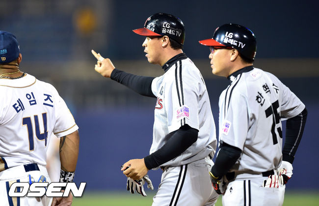 24일 오후 창원시 마산구장에서 열린'2015 타이어뱅크 KBO리그' NC 다이노스와 LG 트윈스의 경기, 5회초 2사 LG 이병규가 안타를 날린뒤 사인을 보내고 있다.