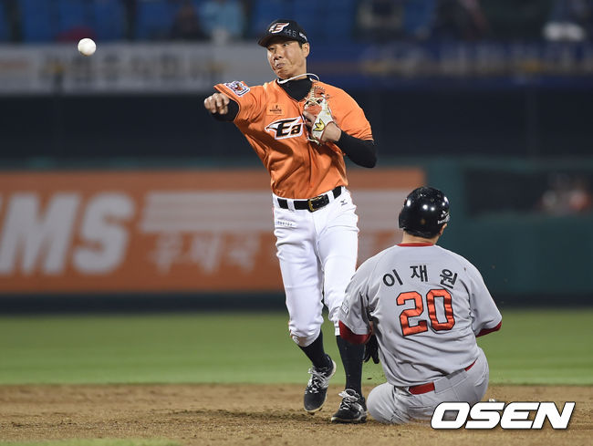 4회초 1사 1루 한화 권용관이 SK 임훈의 내야 땅볼때 1루주자 이재원을 포스아웃으로 잡아낸 뒤 1루로 송구하고 있다.