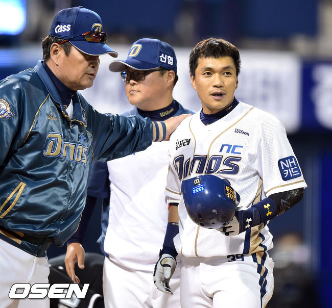 24일 오후 창원시 마산구장에서 열린'2015 타이어뱅크 KBO리그' NC 다이노스와 LG 트윈스의 경기,5회말 LG 임정우의 높은 공을 피했던 NC 이종욱이 파울을 했다. 깜짝 놀라 쓰러진 이종욱이 안도의 한숨을 쉬고 있다.