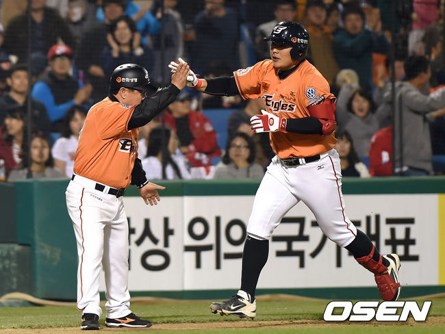 4회말 1사 한화 김태균이 솔로 홈런을 때린 뒤 김광수 코치와 하이파이브를 하고 있다.
