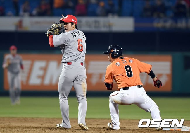 6회말 무사 2루 한화 정근우가 김경언의 타석때 포수 견제로 아웃당하고 있다.
