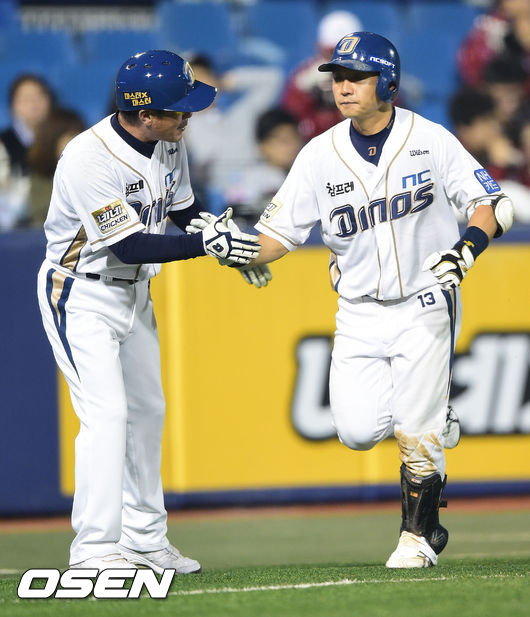 24일 오후 창원시 마산구장에서 열린'2015 타이어뱅크 KBO리그' NC 다이노스와 LG 트윈스의 경기,7회말 2사 1,2루 NC 손시헌이 3점 홈런을 날리고 이광길 3루 코치와 하이파이브를 하고 있다.