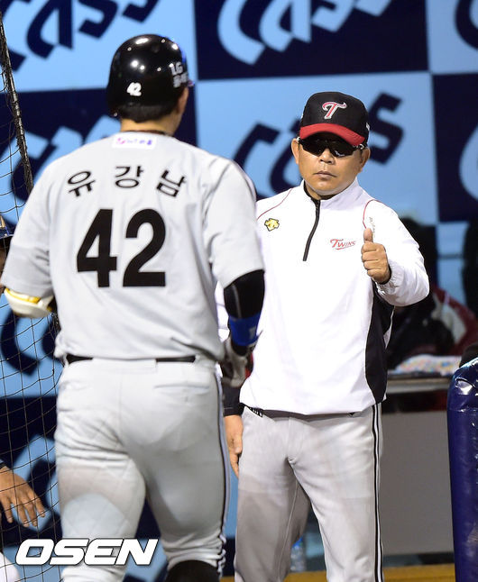 24일 오후 창원시 마산구장에서 열린'2015 타이어뱅크 KBO리그' NC 다이노스와 LG 트윈스의 경기,8회초 LG 선두타자 유강남이 솔로홈런을 날린뒤 양상문 감독의 축하를 받고 있다.