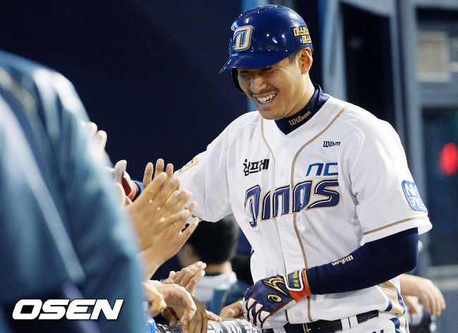24일 오후 창원시 마산구장에서 열린'2015 타이어뱅크 KBO리그' NC 다이노스와 LG 트윈스의 경기,8회말 NC 조영훈이 솔로홈런을 날린뒤 동료들의 축하를 받고 있다.