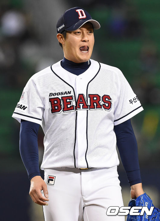 24일 오후 서울 잠실구장에서 열린 '2015 타이어뱅크 KBO 리그' 두산 베어스와 KIA 타이거즈의 경기 8회초 1사 2루 이범호의 내야땅볼 상황, 유격수의 송구 실책이 일어나자 김강률이 아쉬운 미소를 짓고 있다. 2루주자 필은 3루까지. 이범호는 2루까지 진루.