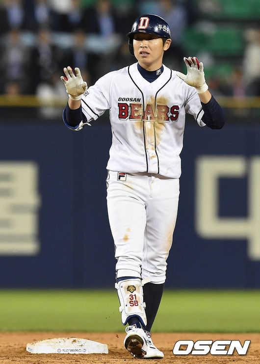 24일 오후 서울 잠실구장에서 열린 '2015 타이어뱅크 KBO 리그' 두산 베어스와 KIA 타이거즈의 경기 8회말 1사 2루 정수빈이 1타점 적시타를 치고 2루까지 진루해 있다.