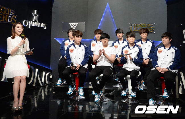 경기를 마치고 롤챔스 조은정 아나운서가 승리팀 SK텔레콤의 인터뷰가 진행되고 있다. / rumi@osen.co.kr