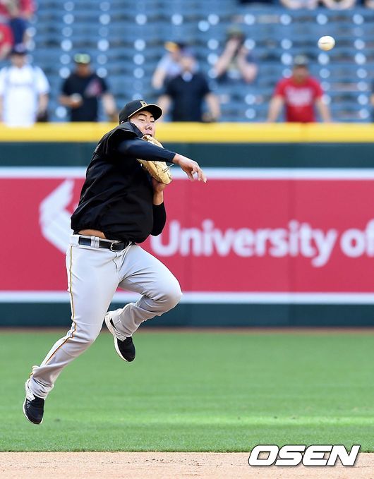 25일(한국시간) 미국 애리조나 주 피닉스 체이스 필드에서 열리는 '2015 메이저리그' 애리조나 다이아몬드백스와 피츠버그 파이어리츠의 경기를 앞두고, 피츠버그 강정호가 수비 훈련을 준비하고 있다. 오늘 경기 선발 라인업에서 제외된 강정호는 벤치에서 경기를 시작한다.