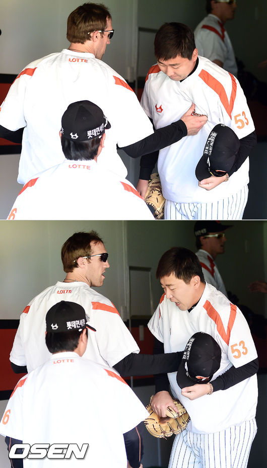 25일 오후 부산 사직구장에서 열린'2015 타이어뱅크 KBO리그' 롯데 자이언츠와 삼성 라이온즈의 경기에 앞서 롯데 린드블럼이 이상화의 가슴을 잡으며 장난을 치고 있다.