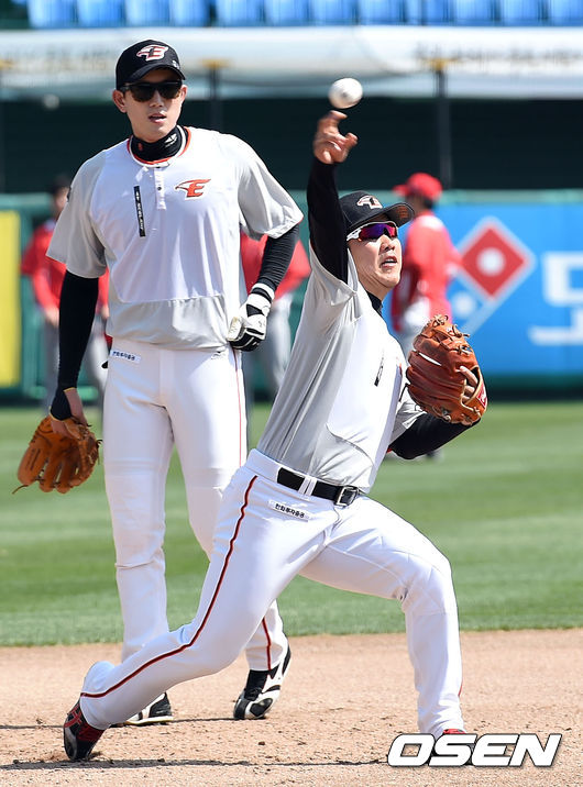 경기전 한화 정근우와 김회성이 펑고를 받고 있다.