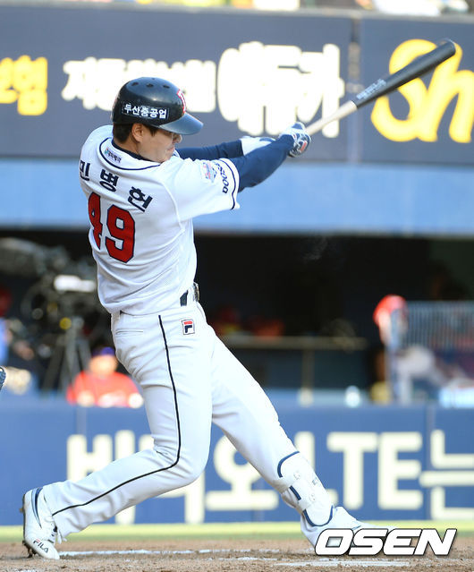 2회말 2사 2루 두산 민병헌이 1탁점 2루타를 때리고 있다.