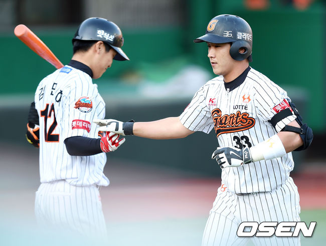 25일 오후 부산 사직구장에서 열린'2015 타이어뱅크 KBO리그' 롯데 자이언츠와 삼성 라이온즈의 경기,2회말 2사 롯데 정훈이 백투백 홈런을 날린후 김민하와 하이파이브를 하고 있다.