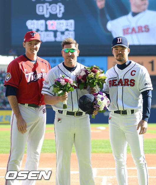 경기에 앞서 노히트노런을 기록한 두산 마야가 KIA 필과 오재원과 기념촬영을 하고 있다.