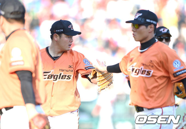 한화 송창식이 3회초 수비를 마친 뒤 야수들과 하이파이브를 하고 있다.
