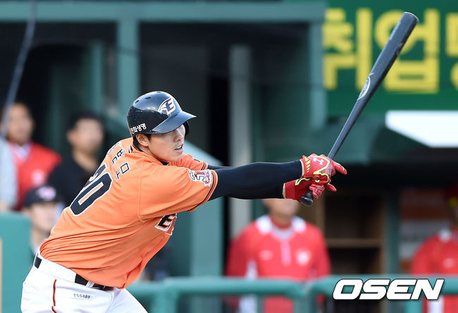 4회말 2사 3루 한화 정범모가 1타점 적시타를 때리고 있다.