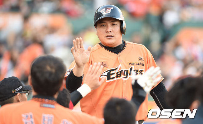 4회말 2사 3루 한화 김태균이 정범모의 적시타로 득점을 올린 뒤 기뻐하고 있다.