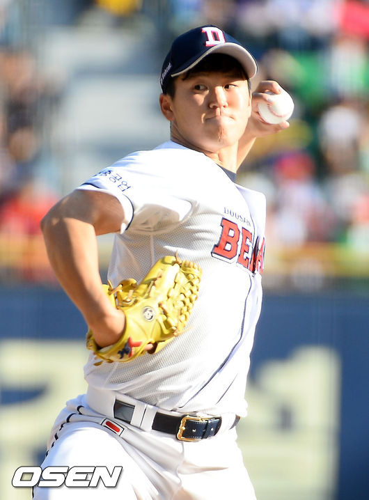 1회초 두산 선발 진야곱이 힘차게 공을 뿌리고 있다.
