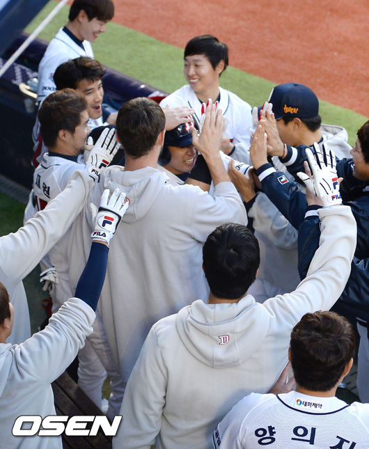 6회말 1사 솔로포를 날린 두산 김재환이 덕아웃에서 동료들로 부터 환영을 받고 있다.
