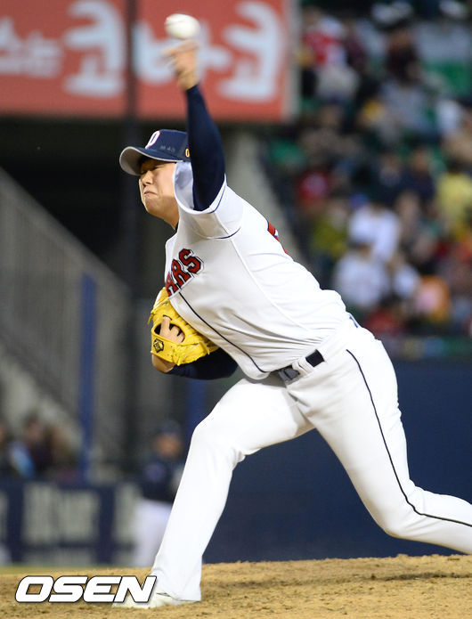 8회초 두산 함덕주가 힘차게 공을 뿌리고 있다.