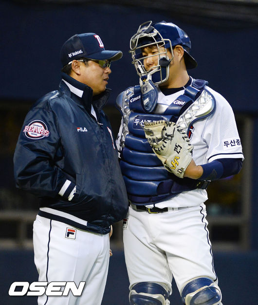 8회초 두산 김태형 감독과 양의지가 이야기를 나누고 있다.