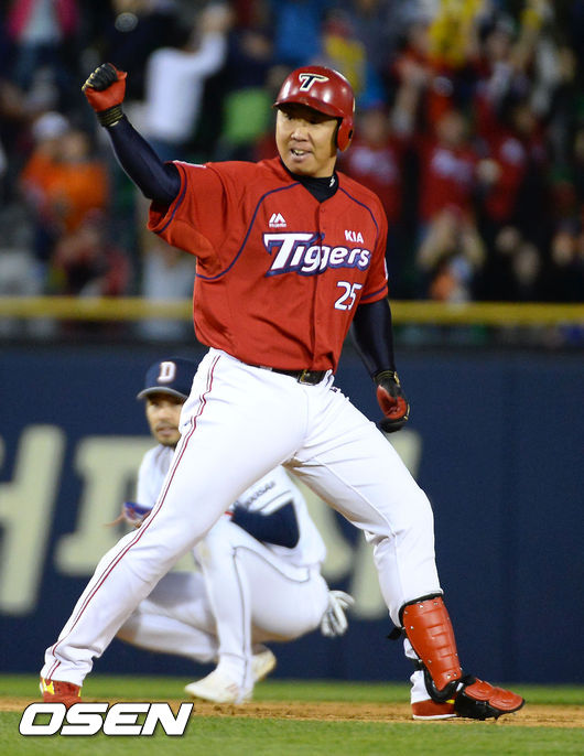 8회초 1사 1,2루 2타점 2루타를 날린 이범호가 세리머니를 하고 있다.