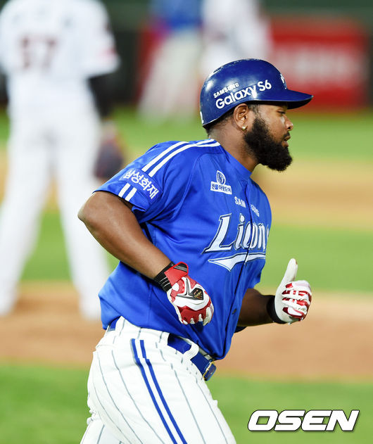 25일 오후 부산 사직구장에서 열린'2015 타이어뱅크 KBO리그' 롯데 자이언츠와 삼성 라이온즈의 경기,7회초 삼성 나바로가 솔로홈런을 날리고 베이스를 돌고 있다.