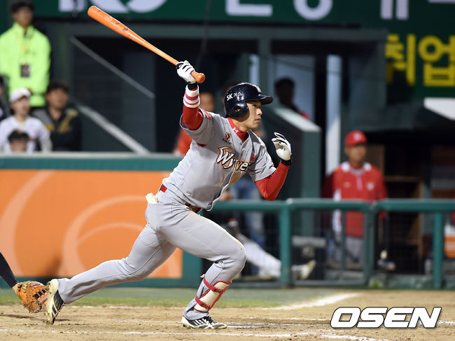 7회초 1사 2,3루 SK 이명기가 1타점 적시타를 때리고 있다.