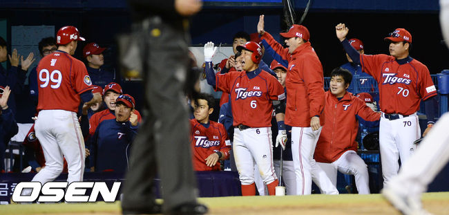 8회초 1사 1,2루 이범호의 2타점 2루타로 홈을 밟은 고영우와 필이 덕아웃에서 동료들과 기쁨의 하이파이브를 나누고 있다.