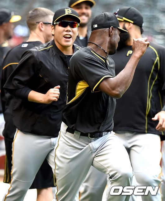 26일(이하 한국시간) 미국 애리조나 주 피닉스 체이스필드에서 열리는 '2015 메이저리그' 애리조나 다이아몬드백스와 피츠버그 파이어리츠의 경기를 앞두고, 피츠버그 강정호와 리즈가 몸을 풀며 대화를 나누고 있다.