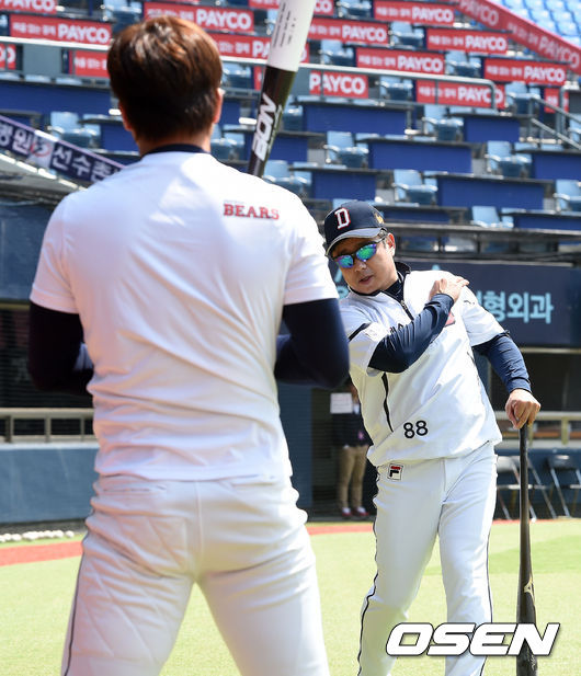 26일 오후 서울 잠실야구장에서 열린 '2015 타이어뱅크 KBO리그' 두산 베어스와 KIA 타이거즈의 경기, 경기에 앞서 두산 김태형 감독이 타격 훈련을 지도하고 있다.