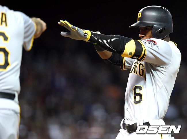 9회초 피츠버그 공격 2사 2루 상황 스탈링 마르테가 역전 1타점 좌전안타를 날리고 1루에 안착해 환호하고 있다.