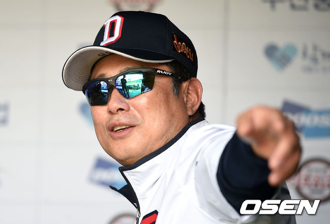 26일 오후 서울 잠실야구장에서 열린 '2015 타이어뱅크 KBO리그' 두산 베어스와 KIA 타이거즈의 경기, 경기에 앞서 두산 김태형 감독이 취재진과 이야기를 나누며 미소짓고 있다.