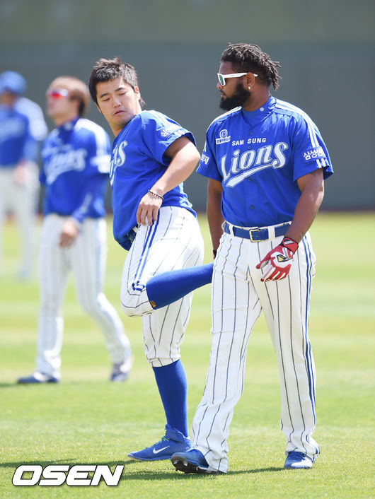 26일 오후 부산 사직구장에서 열린 '2015 타이어뱅크 KBO리그' 롯데 자이언츠와 삼성 라이온즈의 경기에 앞서 삼성 박석민이 나바로에게 장난을치고 있다.