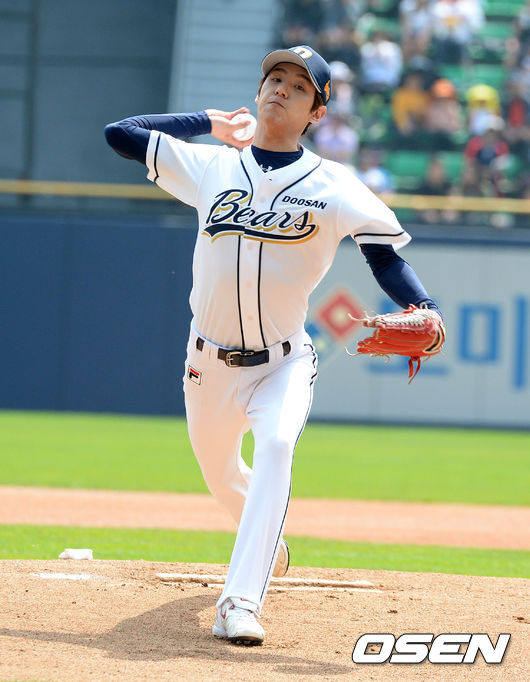26일 오후 서울 잠실야구장에서 열린 '2015 타이어뱅크 KBO리그' 두산 베어스와 KIA 타이거즈의 경기, 경기에 앞서 배우 곽시양이 시구를 하고 있다.