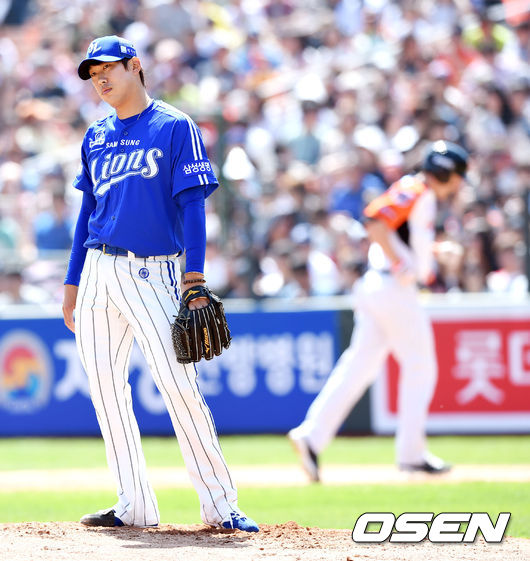 26일 오후 부산 사직구장에서 열린 '2015 타이어뱅크 KBO리그' 롯데 자이언츠와 삼성 라이온즈의 경기, 1회말 롯데 선두타자 아두치의 외야플라이때 삼성 선발투수 윤성환이 깜짝 놀라고 있다.