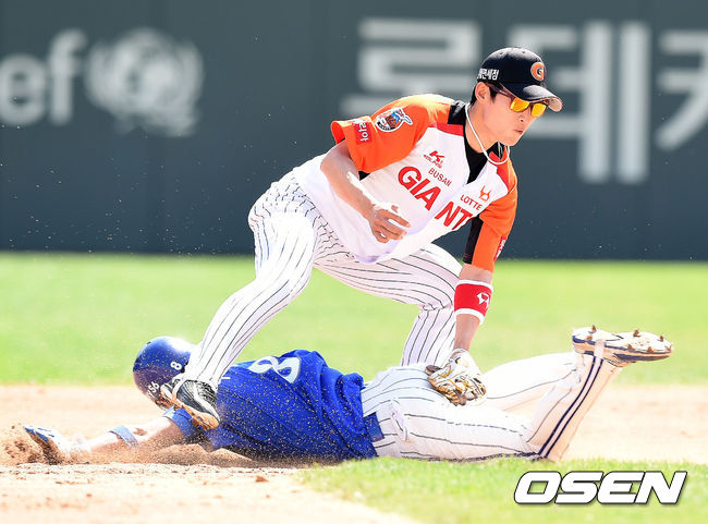 26일 오후 부산 사직구장에서 열린 '2015 타이어뱅크 KBO리그' 롯데 자이언츠와 삼성 라이온즈의 경기, 3회초 1사 1루 삼성 김상수의 타석때 도루 시도한 1루 주자 우동균이 롯데 김동수 2루수에게 태그아웃되고 있다.,