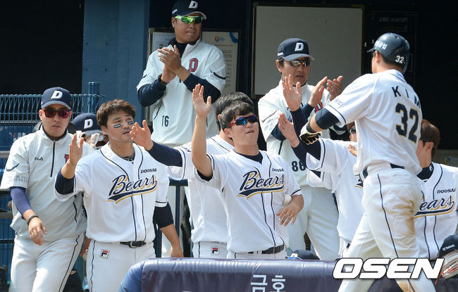 26일 오후 서울 잠실야구장에서 열린 '2015 타이어뱅크 KBO리그' 두산 베어스와 KIA 타이거즈의 경기, 2회말 1사 1,2루에서 두산 김재환이 최재훈의 적시타에 홈을 밟고 더그아웃에서 동료선수들과 하이파이브를 하고 있다.